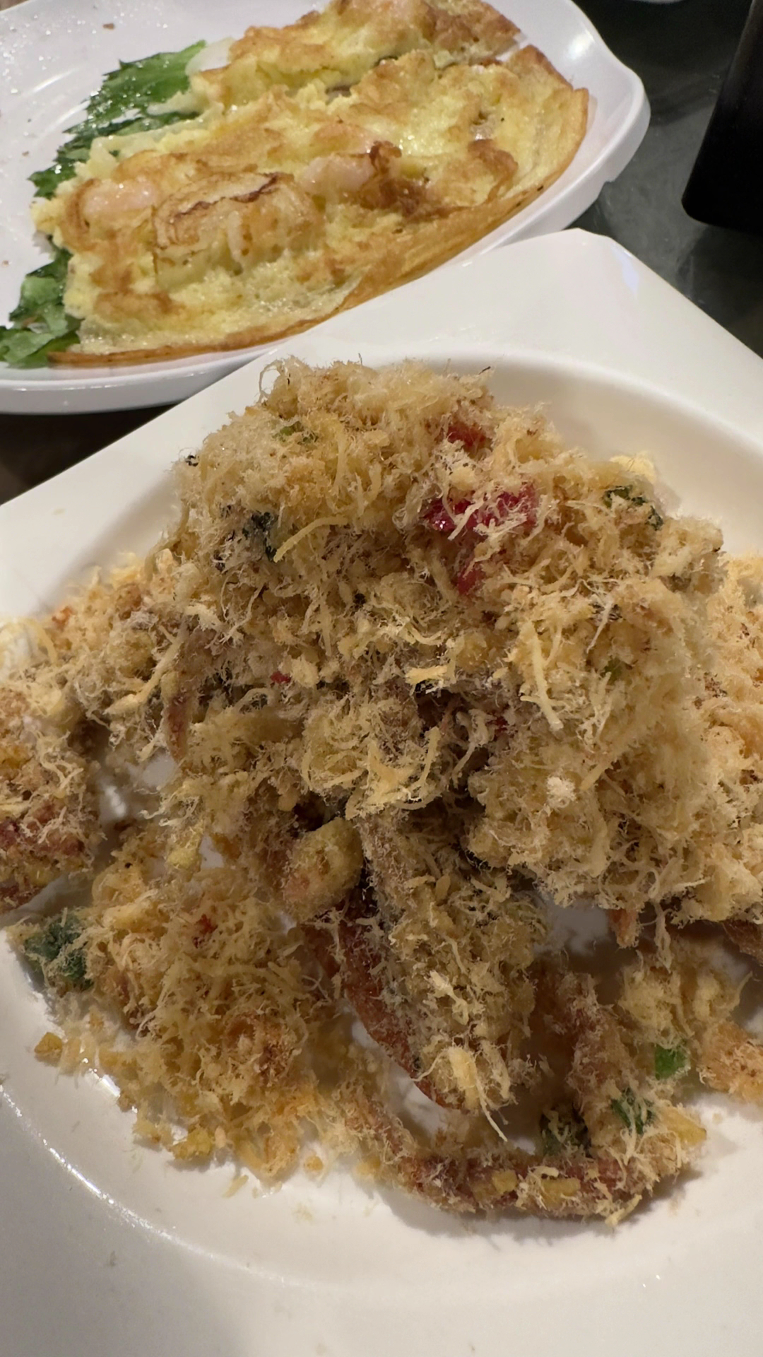 Prawns the shells of the prawns were stucked and fixed into the meat. It wasn’t deep fried and trying to eat it in full may cut your throat.