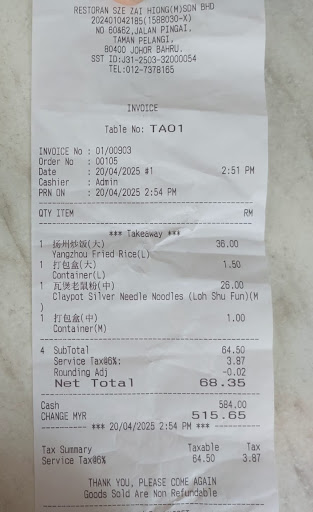 We ordered take away, yangzhou fried rice, and claypot silver noodle, but upon ordering my husband requested if they can change the Char siew pork into chicken in the fried rice. The girl in the counter said its ok no problem will change the pork into chicken. My husband doesn't eat pork. And so she process the bill and we paid.. Tadaaaa after the payment is being processed she said immediately that the kitchen doesn't have chicken😳 And they will change it to seafood😳 my husbdan is allergy to seafood. What a blunder. And I wanted it to order pork ribs yam and white rice but I changed my mind because of the chaos.. and so I didn't confirm the order but she processed the order without confirming me. Another chaos I started to get angry... Because first the chicken pork incident then this no confirmation order and she is billing me.. I am actually willing to just take the porkribs but it's not even ready.