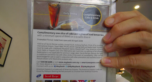 Absolutely misleading customer information. We informed the waitress/cashier in advance that we wanted to qualify for the complimentary cake and drink promotion using the credit card. Secret Recipe (SR) should at least mention that their complimentary cake and drink promo is specifically any cake below rm8.80 and their drink is ONLY iced lemon tea for using a Maybank Card. No mention whatsoever. Ended up ordering a cake above rm8.80.