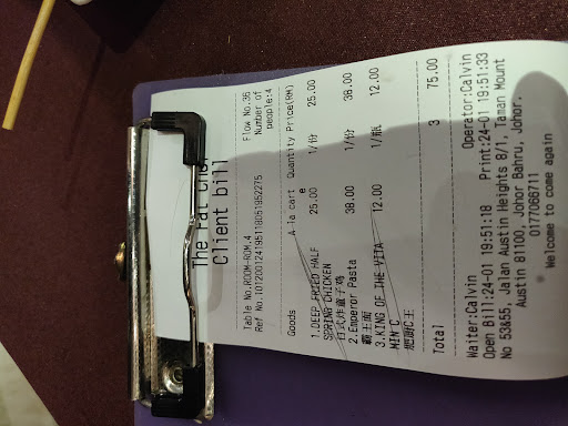 Ambience/Cleanliness/Decor: clean and plenty of seating around. Furniture is of good quality. Service: Fast and responsive. Even though it was full house on CNY eve, the servers were quick to answer when called. Food: This is the main criticism for me. Firstly, the spring chicken was bland, didn't really stood out. Wedges was the frozen kind. As for the pasta dish, the spaghetti was not fully cooked to al dente. Can still feel it was firmer than normal. Chicken chop was ok but the pepper sauce was way too strong until it overpowered any meat if dipped into it. Worse is the corn. It was tasteless! Even frozen corn tasted better than this. Highlight of the dish was the king prawn.