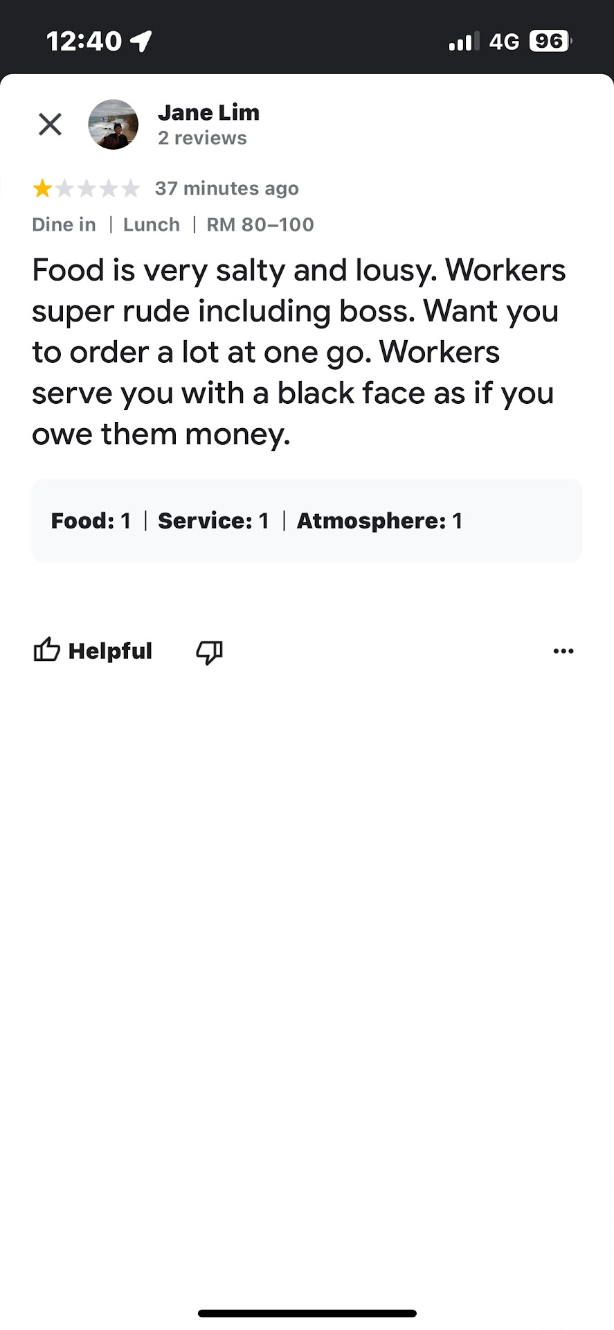 Saying the truth out so that others can ignore Jane Lim’s comment as it is bringing bad reputation to the restaurant and this is...