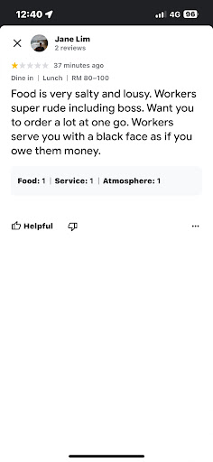 Saying the truth out so that others can ignore Jane Lim’s comment as it is bringing bad reputation to the restaurant and this is...