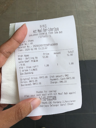 Oh just fyi, I asked my friend because the next day she also went to this restaurant, she ordered mee tarik and dumpling. She told me she also got only one short receipt (apart of the total...