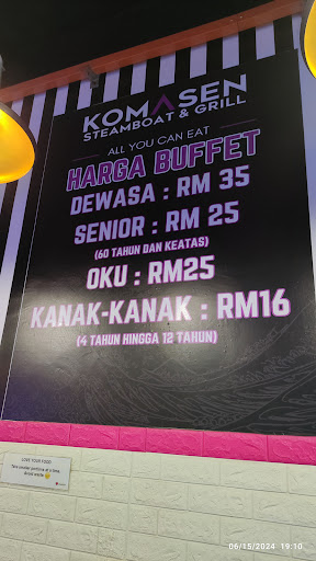 Read more28/8/2022, heading to KOMASEN from IOI City Mall (25 minutes). Arrived during raining around 7:30pm. Price($35/Adult, $15/ Child), reasonable price. Please maintain this price. Taste of Tom Yam really tasty and great, not spicy, suitable for child and family. Limited seafood, but I can consider okay. Friendly staff, YES. CLEAN toilet and prayer room. Salute and appreciate. Great 'Bubur Jagung', do try this menu's (compulsory). Suggestions: complimentary menu's, nasi goreng, Mee goreng, Kueh Teaw, meehoon Singapore and others. Will...