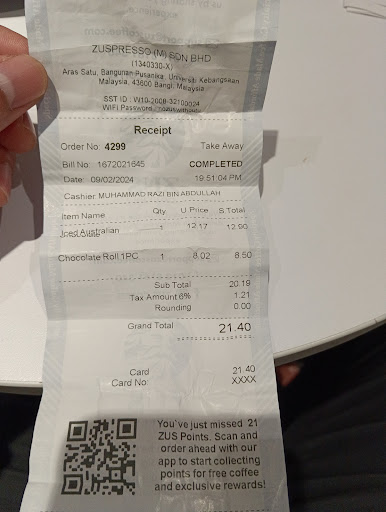 This cashier muhamad razi main phone. Dah bayar pakai kad dia terlupa nak pulangkan kad, sampai ditegur, sbb tgk phone. But it's fine, until i realize i ordered 2 drinks, yang sampai hanya 1. Bila tgk receipt this cashier memang tak dengar and only record 1 drink.