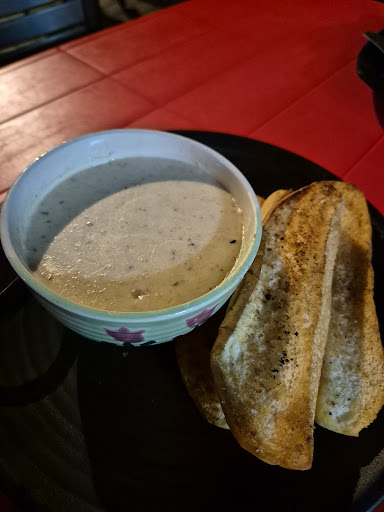 Mushroom soup tasted weird with chlorine taste, and I stopped after one scoop. The toast came with the soup and was also cold and limp.