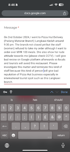 Read moreOn 2nd October 2024, I went to Pizza Hut Delivery (Padang Matsirat Branch) Langkawi Kedah around 9:30 pm. The branch not closed yet but the staff (women) refused to take my order although I want to order over MYR 100 meals. She also show her rude attitude towards me (please check CCTV). I will give bad review on Google platform afterwards so locals and tourists will avoid this restaurant. Please investigate this matter and terminate this kind of staff because this kind of person will give bad reputation of Pizza Hut business especially in international tourist spot such as this...