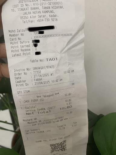 Read moreThis SR, provide quite fast service. But they had issues in communication between them(employee). After scan the member code, thought I can use the promotion given for the member as what I have ordered. But turn out, I need to pay as usual(without) the promotion as they said, I did not told them earlier. And at last the cashier, can said, (not sure he bluffing or not) that the promotion already limited for that day🙄. Hello, since when u limited promotion, when I just ordered at 12N and your shop only open at 10am. No compensation given. U guys should take notes on what have ordered, n enter the correct as ordered. If we ordered any promotion please take...