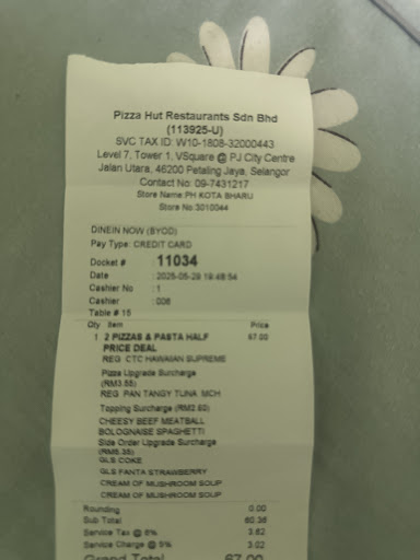 Read morePizza hut company please take note.. this is by far the worst service from pizza hut's branch. My wife and I went on chill friday evening.. less than 10 tables occupied, staffs were reasonably enough. we were not greeted(which is okay for me), we were not usher-ed to the table (still okay), the worst part is, there are 2-3 waitress saw us sitting at the table but they act like we're not even here. menu was given after 5 minutes of waiting and I HAVE TO ASK FOR THE MENU. All i heard is your staff chit chatting which i dont know what's the problem. Main course came first, then appetizers later.. why? please pizza hut. you need to...