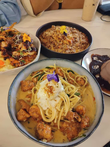 As for the foods: The Panna Cotta tastes more like a dadih :'( it's cute. But not Panna Cotta like the Panna Cotta. The spaghetti Bolognese wasn't served like in the picture hence the picture that we took seems like something topped with grated coconut. *We placed our order through WhatsApp and one if it is Hainan chicken chop. But when we placed the order at the counter, they said the Hainan chicken chop wasn't available. But the next customer after us, was eating Hainan chicken chop at the table on our left 😅 *The flowers on the foods is supposed to be a decoration I guess because the yellow one taste so bitter .. but other flowers taste good.