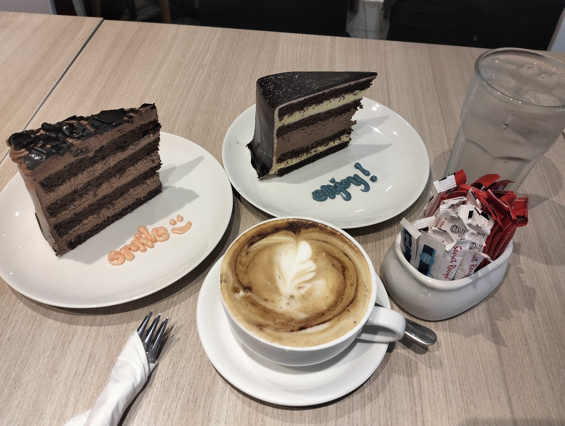 The food and drinks are so nice and we really enjoyed it. The cakes are also tasty too.... but we haven't found our favorite cakes like American Chocolate, The Red Velvet and others like butter cakes. And another important things why i gave only 3 star's is because the staff told me that.... the company or factory of secret recipe didn't provide tea break time special saving like how the do in normal days.... this is so bad, unacceptable because not everyone able to enjoy while busy and working days.... most of us will be enjoying it in weekend days or public holidays like this with their beloved family members and friend's. And after spending so much on lunch break time there and continue to have tea break time... with the special saving on tea break time menu.... suddenly one of the staff told me that on specific holidays and weekend days no special savings or discounts available.... but all only under ala cart basis. That's why i gave 3 ⭐ and was really upset about the 2 main points above. Hopefully the secret recipe big boss will review this and workout something on this complaint and add comments if there...
