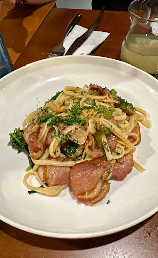 This evening, the 8 of us ordered a mushroom soup which came with sourdough bread (great little detail which did not go unnoticed), two grilled barramundis (fresh fillet with its skin done crispy), two types of wood oven pizzas (gone in minutes), a smoked duck aglio olio linguine (da bomb) and a pesto-almond spaghetti (va va voom).