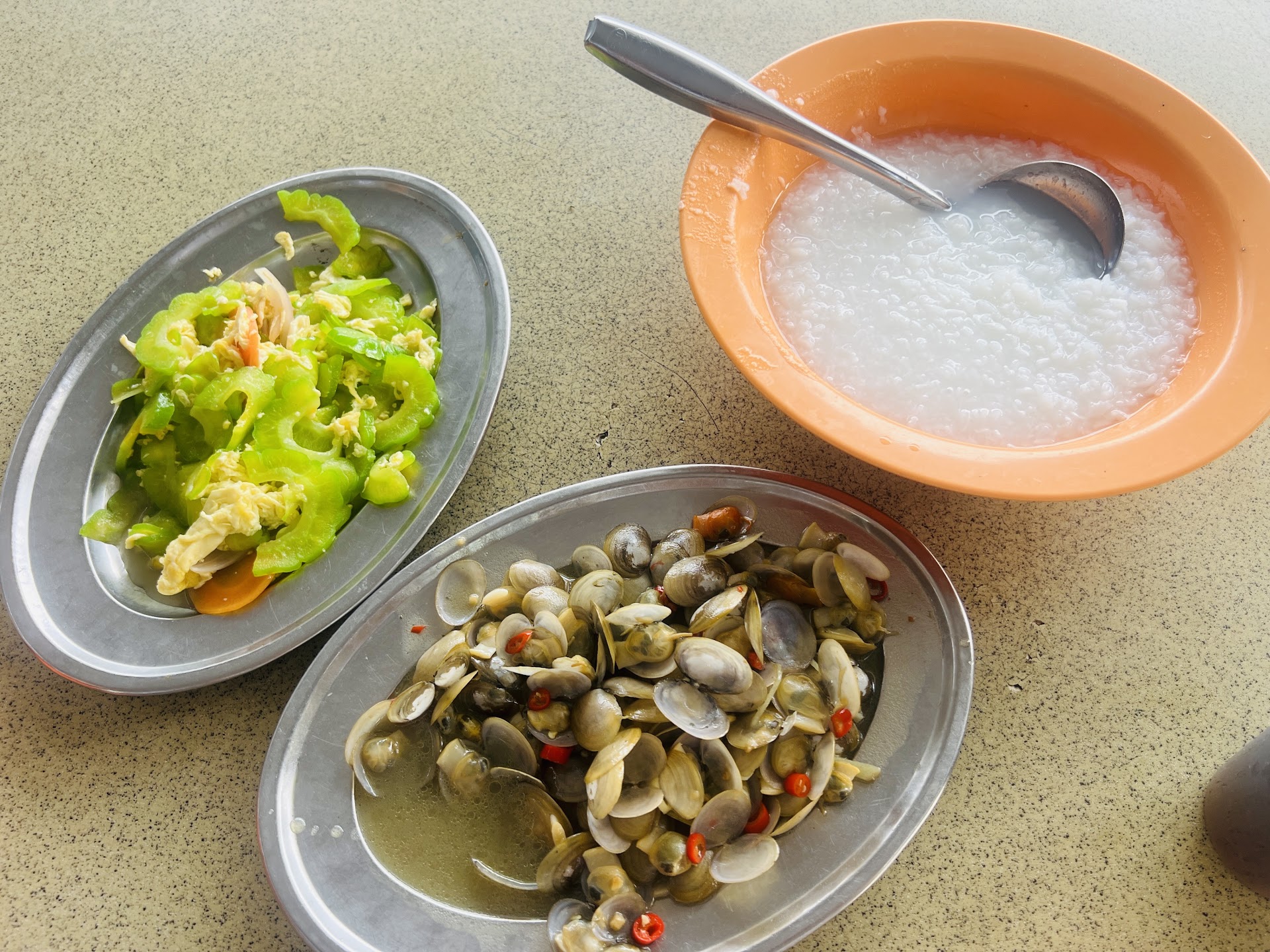 Read moreThis is the saddest restaurant I have been to so far, the lady taking orders was behaving like she hasn't got a raise for ages, ask for menu, she won't reply, just kept on asking 'what you wanna eat?' Food was so so only, not to say cheap, but reasonable, deepfries fish dry was too plain, fishes were too tiny, smelt burnt due to excessive frying. The plain porridge was the best, cos it's plain, no need any msg. Seatings outside by the walkway was so stuffy and warm, no fan to cool us down, other patrons just puffing away without considering us. This would be my 1st...