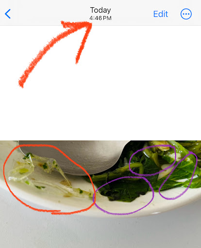 We normally just close one eye but today I not only found leaves that should have been discarded, I found black bits in the mixed cauliflower/broccoli dish PLUS a piece of plastic which I almost choked on (circled in orange).
