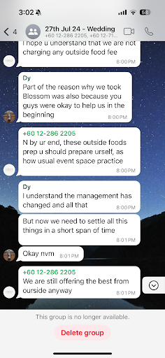 I don't think this event coordinator understand how stressful planning a wedding is. Under a month, you tell me everything that was promised now cannot be done. He told us we should be reminded that they didnt charge us extra for catering? That's what you sold to us in Nov 2023! In that moment, my partner and I almost lost our temper but instead we kept it cool. I had a panic attack and my partner had to calm me down. Thankfully our caterer, Running Man was so kind to rescue us by borrowing us 1 table, chairs, drinking water, cutleries and ice cubes free of charge.