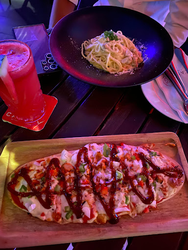 The menu is extremely overpriced. Cocktails and food are charged like you’re at a luxury sky bar, but the quality is far from it. Drinks tasted watered down, and the food was forgettable at best. Service was average — not bad, but nothing that would justify the price tag or the pretentious vibe of the place.