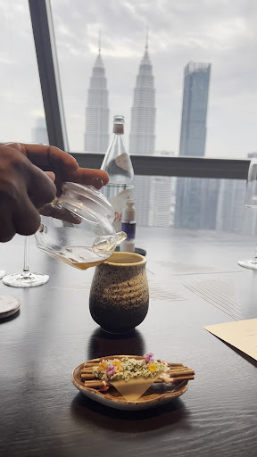 The wine pairing throughout the meal connected Malaysian cuisine to a global story. Each wine was thoughtfully selected to enhance the flavors. For instance, the Beaujolais Villages brought a light, fruity note that complemented the venison’s richness, while the Rosé from Fire Gully added a crisp, refreshing contrast to the earthy flavors of the eggplant and yam. A Riesling provided a sweet balance to the tangy fermented rice and toddy, while the Chianti Classico’s robust body paired perfectly with the hearty pigeon. The final touch of sherry, Solera 1847, with its deep, complex sweetness, beautifully complemented the banana leaf ice cream and Kuih Sarang Semut. A view of the Petronas Towers right in front of our table took the experience to a whole new level, making the evening even more memorable. However, the overall experience was slightly marred by a few issues. While the staff was generally attentive, there were lapses in detail such as drips on the plate, dirty napkins, and a lack of dress code enforcement, with diners in shorts and sneakers bringing down the experience. After a trip to the bathroom, our dirty napkins were folded instead of replaced, which was a surprising oversight in an otherwise meticulously crafted evening. I must confess that I probably forgot which wines went with each specific dish, being so caught up in the narrative woven by the meal. Each dish was a chapter, each flavor a sentence, weaving together a narrative that honored tradition while embracing modernity. The smoked patin, in particular, stood out as a highlight, showcasing the chef’s exceptional talent and deep understanding of the ingredients and techniques that define Malaysian cuisine. The expertly paired wines enhanced this experience, linking the local flavors to a broader global...