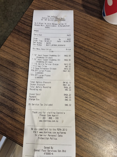We visited the branch to celebrate my son’s birthday and placed an order worth RM 94, which included a Hand Toasted Shawarma Chicken pizza, spaghetti, and fries. Unfortunately, the quality and presentation of the food were very poor. The pizza was essentially just bread with no noticeable chicken, despite the name. The spaghetti had only red sauce, with a very small portion that did not justify the price.