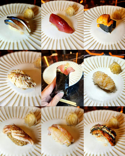 1.Madai 2.Shima aji 3.Baby geoduck Prawn - sabah 5.Salmon belly 6.Kinmedai 7.Salmon 8.Hirame 9.Chutoro 10.Scallops Amaebi 12.Akami Saba Unagi 15.Otoro Mud crab Uni 18.Tuna...