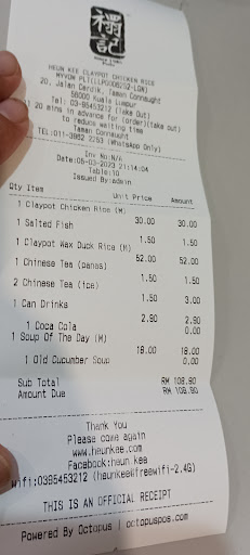 Read moreLong time did not eat claypot chicken rice. Nearest untried is this Connaught branch. Had eaten before at their main shop near Pudu market. 5 stars for food there but difficult to find empty parking. Here at night plenty of parking in front of the shop. Order 2 medium size for 3 person. One normal claypot chicken rice and the other pot try out their lap Mei claypot rice. The chicken deserved 5 stars. Plenty of chicken meat with right amount of marinate. Serve salted fish on a small metal bowl on top of the rice during cooking. Mind You they insist 5o cook using charcoal to bring out the traditional taste. Plenty of lap Mei in the other pot. Nice lap Cheong but the wax duck meat need strong teeth. It is an acquired taste which I do not have. Maybe my grands generation time. Do note lap Mei only available during CNY as they are source from Hong Kong. We also order a double boiler old cucumber medium size. It can feed into 3 bowls and still have extra. We stuff ourselve to finish the food ordered. Next time will go for the belly meat. The shop also sells other dishes like pig trotter vinegar, pig stomach soup, yellow wine chicken and others. All food are cooked right in front...