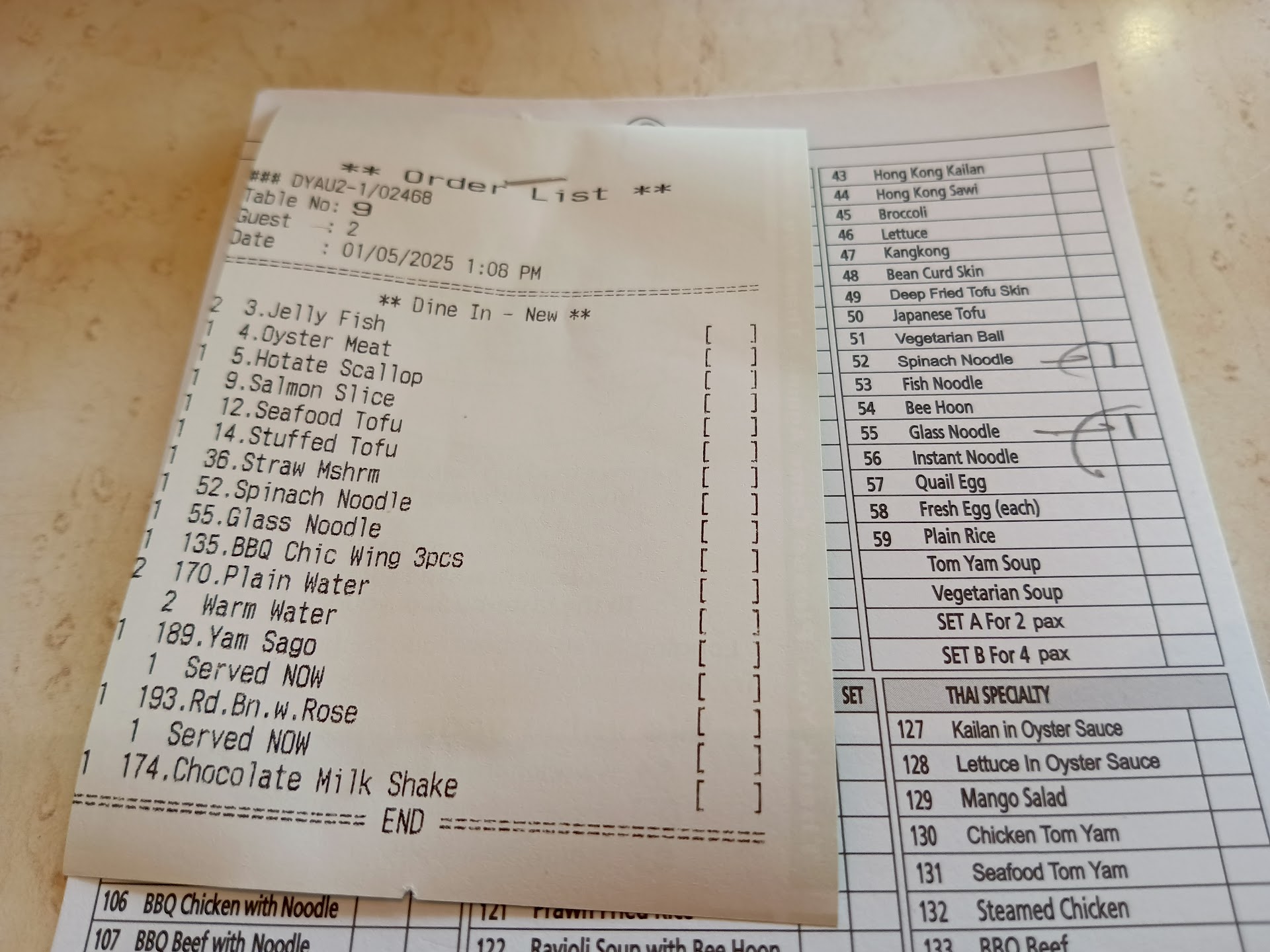 The waiter lost our order sheet and order that key-in in the system was only 1/5 of our order. We have to call them and order for three times but still got mistake in the key-in bill. The waiter didnt mention anything to us about out of stock items. We have to ask several times then the other waiter said the item was in stock but forgot to key-in the order. Although we call the waiter several times and said about his mistakes he finally said sorry.
