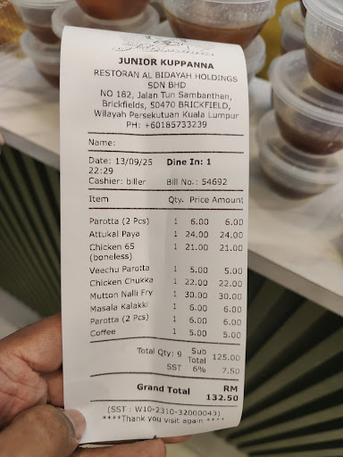 Read moreI visited Junior Kuppanna Brickfields branch around 5 times till now. Our favourite was mutton nalli fry which is around 32RM. Last two times, really disappointed with this. I have listed 3 of my concerns on mutton nalli fry which was ordered before 2 months and from my latest visit on Sep-13, 2025. I expected the quality to be improved this time but still same. Listing down the concerns from mutton nalli fry below, #1: Mutton nalli fry portion was very less compared to earlier visits. Though it's understandable that the number of pieces depends on portion, I am very sure that quantity has been reduced. #2: More bone and very less flesh in 2 out of 3 nalli fry pieces served. One piece was good. #3: Quality has reduced and flesh seems uncooked or from old mutton. Please improve the quality, quantity of this dish which was my earlier favourite. We have even reported this to server, manager but they suggested to write here instead of taking any action. Additionally, I have another concern of aatukal paya which is really not the authentic paya. Too thick and flesh had fat, skin covering majority of portion. Hereafter definitely will not order this. Really disappointed. Parotta, Chicken 65, Chicken Chukka was really good and no concerns on those items. Please improve quality of mutton nalli fry and aatukal paya taste. Attached the bill for...