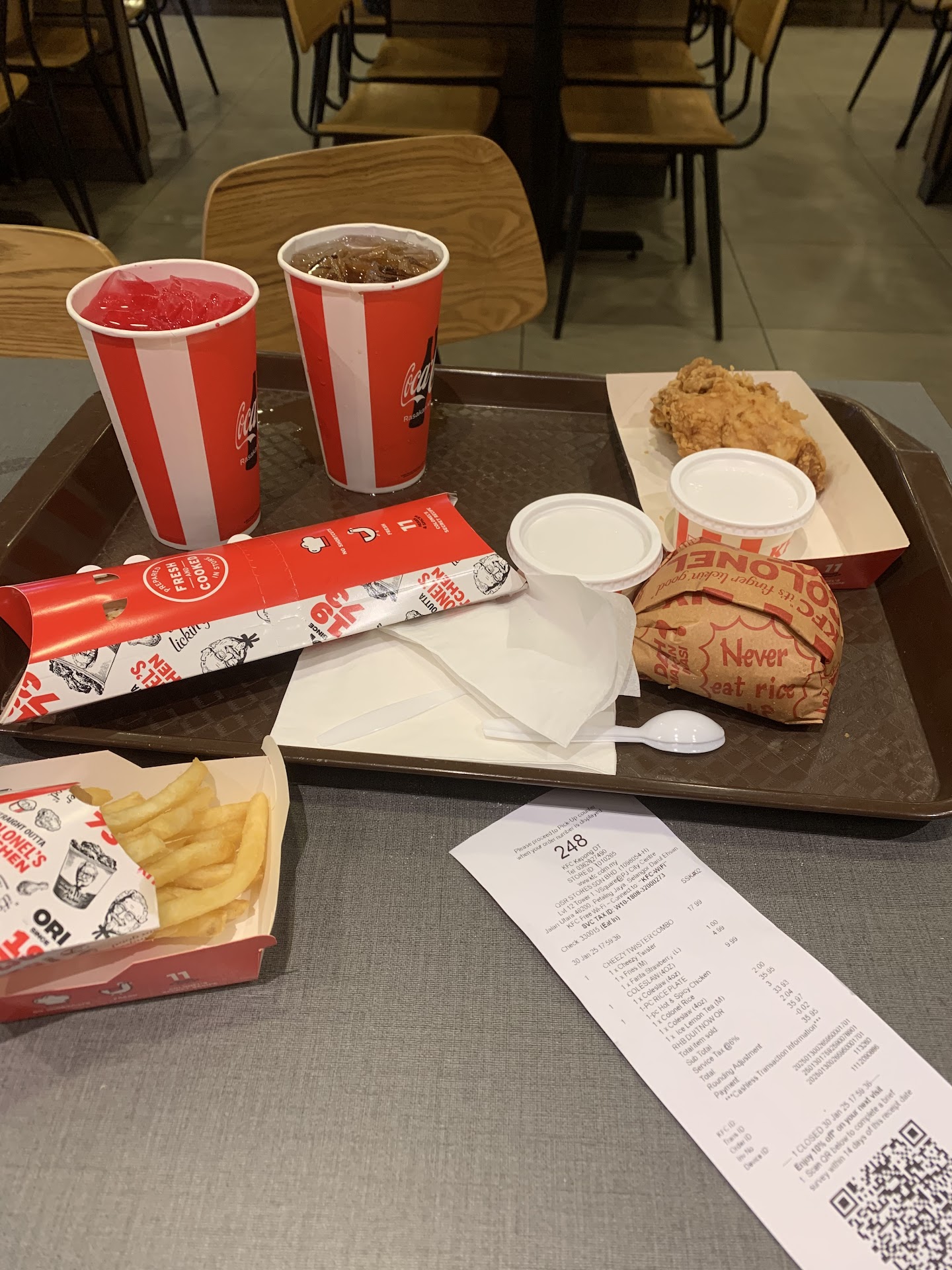 Read moreService is very bad. Staff not competent to resolve app payment issue, and request customer who already present "first" at counter to wait them served new kiosk customer (4 orders) who come later! Did the staff follow first come first serve procedure? I reorder again to resolve the payment issue, after KFC accepty 2nd order, the physical store staff told me the non spicy chicken finished and propose me to accept to take all spicy chicken or wait longer time (30mins). In order not to waste time again here, I decided to accept her proposal because I decided to order McD for kids at home as they cannot eat "spicy" chicken!!