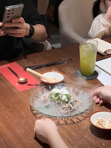 Their grilled fish was dry and tasteless. The server even warned us it was a "rather dry" part of the fish and recommended pairing it with shaved radish, which barely helped. The only redeeming dish was the walnut soba, which was refreshing, but that alone couldn’t salvage the experience. Even the raindrop cake was simply a basic glorified agar agar.
