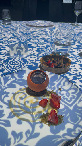 Interactive dessert The interactive part was is breaking a piece of chocolate on the plate and putting in the provided toppings.