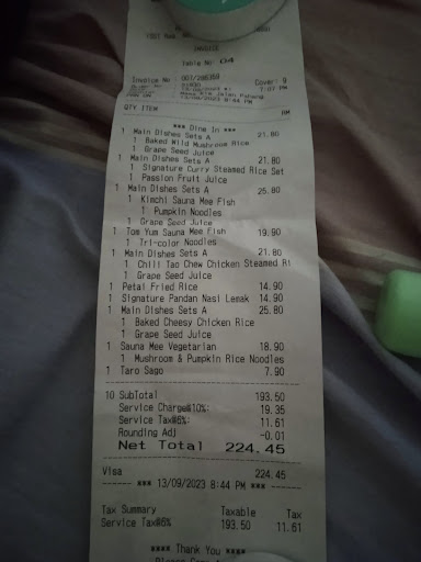 Ordered: Pandan Chicken Nasi Lemak - RM24 for small pieces of dishes put together. Taste wise it is not bad 3/5, but the price relative to the portion is not worth it. Baked Cheesy Chicken Rice - RM20 for the same size dish as compared to last time. As usual it tastes good 4/5 but same as the first dish, price increase is too much for so little. Kimchi Sauna Mee Fish - RM20 for pretty decent kimchi soup and generous with noodles but they only given 3 slices of fish. 3.5/5 taste is unique. Taro Sago - RM8 for Sago and 3 pieces of taro balls. Taste is ok 4/5.
