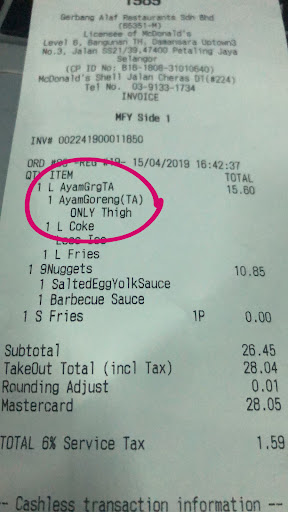 When I order drive thru for ayam goreng mcd, I reconfirmed that please check if they have thigh, if they don’t have then I would order other meals. They confirmed.