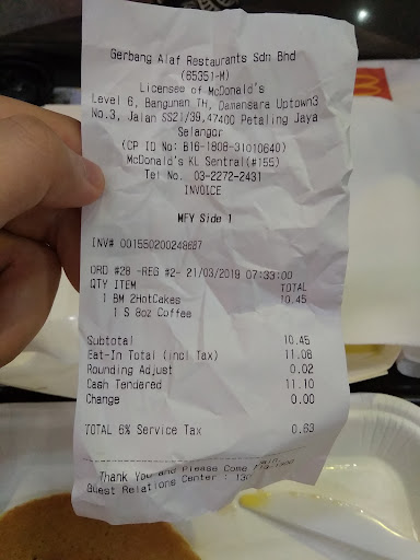 Read moreOrdered a breakfast McMuffin set, bubur ayam and a nasi lemak. They somehow lost our order and we waited a good 20 mins before I checked with them as we were running late. They didn’t have our order and the staff took my receipt and started to make the order, handing everything over to me hurriedly. Checking the bag, there was no hash-brown and straws for the drinks so I quickly requested it. Otherwise everything else looked correct. As we rushed to the gate to board the train, I stopped to arrange the food in the bag properly so it is easier to carry and realized, the nasi lemak had no sambal in it! The bubur ayam was bland as water, there was no salt and seasoning… I ate my nasi lemak with the 3 packs of mcd chili given with it but am utterly disappointed at this horrible service. Nasi lemak is nothing...