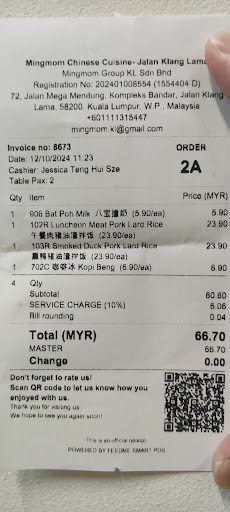MAIN DISH: Pork Lard Rice, Braised Pork Belly with Black Fungus, Ginger Scallion Duck, Pig Trotters in Vinegar, and even the Mala Ban Mian were all so tasty. SNACK/FRIED DISHES: Taro Coins (you can choose not to dip the condense milk if you don't want sweet), Sweet Potato Fries, and Fried Pork Ribs. DRINKS: any of the RM4.50 ones are pretty worth it since they give a large mug of it, like Red Nutmeg, Chrysanthemum, Luohan Guo etc. Otherwise, the kopi/teh are good too. For those who don't want drinks, their water comes with free refills.