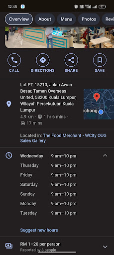 Read moreArrived at oug merchant 10.03an. Placed grocery we just bought in table and the store manager said the table not cleaned. He brought table cloth and try to clean the table while we were waiting at the side and he asked us go to nyonya corner table wait there.