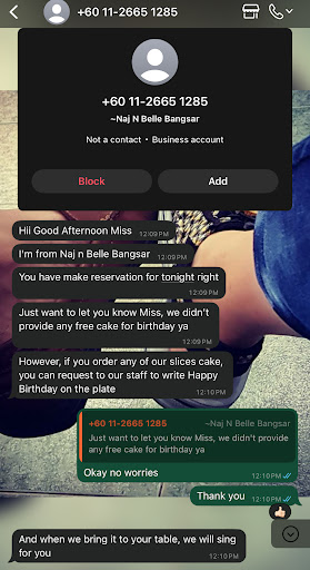 To our surprise, we only received a response on the day of the dinner itself, at 12 PM, informing us that no complimentary cake is provided. By this time, we had already purchased a birthday cake from an external bakery. Only then were we informed that a RM30 of cake fee would apply unless we spent over RM500, something that had never been mentioned beforehand.