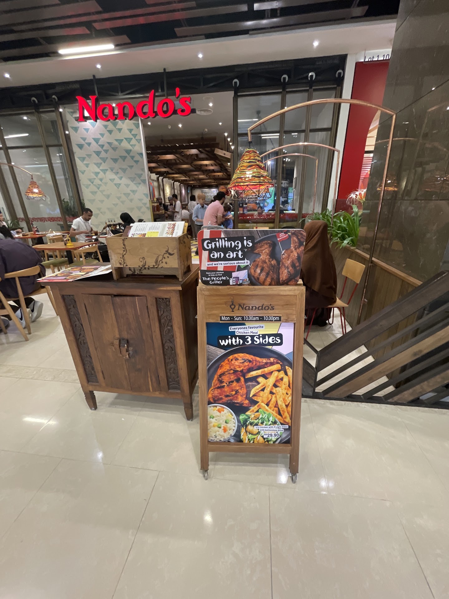 Read moreWent to Nando's, got a seat for 2 by the entrance, restaurant was getting full, we looked at the menu and decided. Calls for the waiter, she looked at us and nod. She then swerve us and went to the entrance to greet other customers (asking the number of pax they're dining for). We waited, surely she'll attend to us shortly. But NO, she went to another table, seated the guests, and went to another table, cleaned it up (when there's already another waiter cleaning that table) and just when she's done, I raised my hands and made eye contact with her, in which she responded with giving me the hand "hold up" gesture. LIKE, I'M WAITING HERE, YOU CLEARLY CAN SERVE ME ON THOSE 3 OR 4 TIMES YOU PASSED BY MY TABLE. And best part, she went to greet another customer at the entrance. Finally after 15mins of waiting, with her lazy attitude, she came to take our order. Ordered, then we waited.Then she sent the cutleries to our table, 2 forks 2 knives and tissues. Food was served by another staff, a trainee, she was friendly and smiled. She noticed that I ordered a rice menu and provided the spoon shortly after. Efficient. Started our meal, some parts of my rice was undercooked so some bites were crunchy. Sad, didn't expect this from Nando's. Then went to the cashier to pay, the first ignorant waiter was blocking the cashier. (What is wrong with this lady!) Proceed payment and left the restaurant. This is the worst Nando's experience. Truly does not deserve to be located in a high class mall like Pavilion.