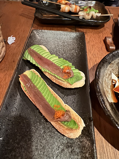 Food: The food is a fusion of Japanese and Spanish influences, where you can enjoy classic Japanese appetizers, yakitori skewers, and some Spanish tapas. We sampled several skewers – chicken breast and wings – expertly cooked, tender, juicy, with a slightly crispy crust and smoky aroma. We also tried the lamb cutlet, which was cooked perfectly – tender and flavorful, with well-balanced spices. The foie gras was cooked well, a seared piece of foie gras served on a crispy cracker with honey, but unfortunately, we ordered two portions and the pieces were quite different in size, one being almost twice as big as the other. I also enjoyed the avocado and anchovy sandwiches, where the salty anchovy perfectly balanced the creamy avocado. The breaded squid was a little non-chewable, but still enjoyable. We were particularly fond of the complimentary cabbage salad in their signature sauce – so good, we even asked for a second serving!