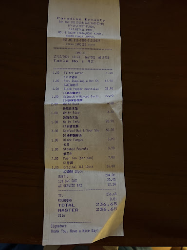 Read moreI was there few weeks ago with my neighbours and had the usual mapo tofu (my favourite!), hot and sour soup etc etc. But the service has dropped tremendously and I realised the surpervisers and servers were new. We were stopped halfway from going in at the front entrance as the manager (I assume he's the manager) to check our vaccine status but there was no one to greet us. We scanned and checked our temperatures on our own actually. He rushed forward to stop us. And the way he waved at us was rude and abrupt. Where's the Good Evening, how are you today? usual polite greetings?! We were seated on the right side with everyone else while the rest of the restaurant was pretty empty. I guess it was easier to manage and short of manpower perhaps? And next came the superviser who not only did not greet us (never mind), he was hovering around our table as if to rush us to order quickly. And he grabbed the pen from my hand when I was repeating my orders as if I was going to steal that pen?! No doubt everyone was wearing mask, I could feel the smirk on his face. No manners, I'm afraid. And when we asked for chilli oil, another Chinese lady came forward with YES?. I had friendlier service and banter with store owners in kopi tiams and mamaks than this! Its all very abrupt, abrasive and petty! We didn't enjoy our dinner at all, to be honest. I left this review only now as I wanted to let it go but upon reading another restaurant (in TTDI) getting unfair and underserving reviews, I felt restaurants good and bad need to be called out, praised or not. Please improve your soft skills, I left Paradise Dynasty, Kiara163 pretty upset and so...