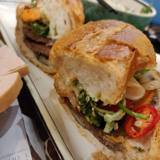 VIETNAMESE BAGUETTE WITH GRILLED PORK PATTIES. This was the best Vietnamese sandwich. The baguette was crispy with the right chewy texture. The grilled pork was flavourful and had a very nice char taste to it. The vegetables were not overpowering the taste of the meat.