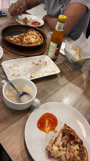 Had lunch with 2 children at the outlet today. We ordered personal pan pizzas and 1 combo meal pizza (comes with choice of soups/drinks). The place was upgraded well probably due to the new CI requirement. As we entered, no one at the reception area so we assumed it is a free seating. All food orders via QR scan, believed due to staff shortage. Turnaround time between order vs food delivery was quite efficient. However, it was not cool to drink Pepsi in room temperature! Requested for ice, but they didn't have/serve ice. Food was OK (couldn't expect much from fast food chain). From my observation, no server on the floor to standby for customer requests. Had to wait for the server's glimpse to request for a refill drinks. Tables were not cleared on time too. Hope the Management can consider to have sufficient supply or consider to have ice cubes and improve on service delivery. That's what the customer expect when paying 10% service tax in...