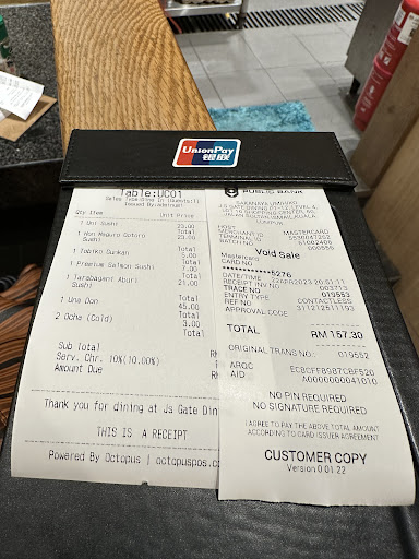 The sashimi platter(not in the photo) which include salmon sashimi and a few other types of fish and prawn. The salmon sashimi make me wanna puke. I ask the manager why the salmon sashimi taste so diff from the usual one he reply that all their âsalmon sashimiâ will be poach in hot water before serve to ensure there will be no parasite in the fish and he also claim that they serve âhigh quality salmonâ. I am ok if the fish is fresh but it is not! I am thinking if it is high quality why there will be parasite in the first place?