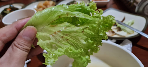 Pork belly was served and looks very small in portion. The pork cut into thicker pieces and my wife said the meat is good. Kimchi side dish and soy bean paste soup are good. The pancake side dish was mediocre.