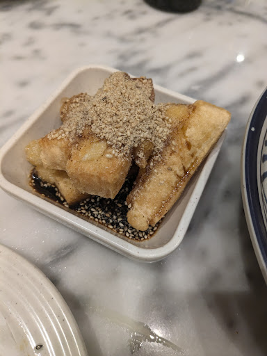 Snack: Fried Bun 3.75🌟 Inside there's a piece of meat and broth with some sort of wine I believe and the flavour is nicely balanced. It's quite hot when served so let it cool down a bit or eat with caution. The top part of the bun is soft and fluffy and the bottom is chewy and crusty. There's the usual chili oil and vinegar with ginger dipping sauce if you want.