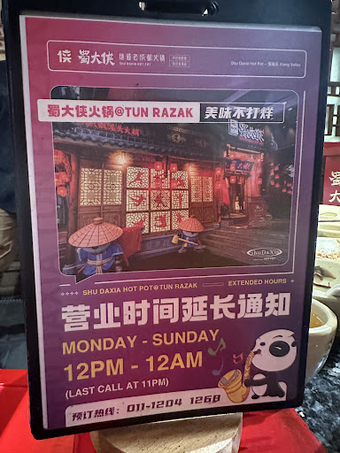 I’m superb love shudaxia steamboat but yesterday it’s was disappointed. We booking 1030pm by call, the people that answered the call didn’t tell us 1030pm is last call. When we reach at 10:17, he told us need to order before 1030pm, all of my friend haven’t reach yet, they will almost 1030pm only reach, how they can order the food. Luckily when they reach still can order beverages. When we finish eat, we saw the poster wrote last call is 11pm!! If he don’t want serve us can let us know when we booking, if we reach at 1030pm then we can’t order anything? Come for 喝西北风?all the service is not so good. We have friend birthday, so we have bring the cake to celebrate with him, when we wanna blow cake, we ring the service bell triple times, no one come in until we open door and call them only come in. All that it’s ok, we know the shop is operating till 12am, once 12:04am, the supervisor come and tell us we wanna close??? In the phone call, he told us can late abit, at the time we just cut our cake, haven’t eat yet, then they drive us away. We know it was tired for the work but if you can’t service well, pls don’t pick up us. And the xhs advertisement must put the date of promotion, we go for the 22% of student promotion, when we pay bills and ask they said it’s was expired. About the payment, it’s no so friendly to us too. Once we order before 1030pm, dishes haven’t been serve. Direct ask us to settle the bills?? I love shudaxia, the taste is good and the dishes is fresh, but the service is too bad!!! Love Sunway branch always, first try tun razak branch and get the super bad service.
