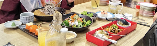 For the foods, we tried tempura soba, dinner set, kitsune udon, chuka kurage, yakitori moriawase, chicken ball, and green tea for beverage. All taste good, especially tempura, i like that soooo much. After my meal, i tried one of their salmon nigiri sushi. Fish is fresh, nice texture. For sauces, i tried their wasabi, mixing in shoyu, it actually taste good!