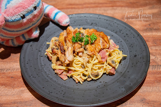 What we personally love about building our own pasta, is the fact that we can make it as flavourful and tasty as possible (although most of the time it may not necessarily mean healthy). Today’s pasta was constructed on a Aglio Olio foundation cooked Al dente and topped with tender, peppery grilled chicken with a slightly crispy skin. This was accompanied by a generous amount of juicy beef bacon with some fat attached adding flavour to the dish. Completing the dish was a downpour of aromatic fried onions, garlic and crunchy mushrooms.