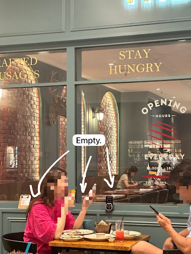 Even worse, there were empty 4-person tables sitting there untouched for over half an hour. For what? Holding them for invisible customers? How many real customers did you turn away because of this ridiculous system?