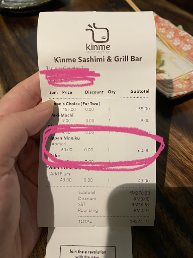 Wanted to order a normal grilled ninniku (garlic) with the price RM5.5 , the waitress suggested to try “the garlic from Japan”. Garlic was served later on, but it was apparently overripe, I can see big green sprouts in every clove. When bill came, my friend and I was SO SURPRISED by the price of this ONE garlic, it was RM60. The waitress should’ve really told us when she was introducing us to try “the garlic from Japan”. Didn’t fight with them, garlic has been eaten, just paid and no more next time.