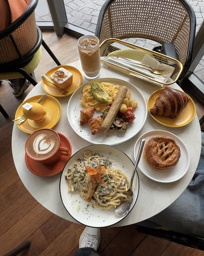 We ordered a wide selection of dishes, and every item was a visual and flavorful treat. The big breakfast plate came with fluffy scrambled eggs, mini croissants, tater tots, mushrooms, grilled tomato, and half an avocadoâfresh and filling. The truffle mushroom pasta was creamy and rich, perfectly seasoned, and generously portioned. Their pastriesâespecially the apple danish and croissantâwere flaky and buttery, and the desserts were not only photogenic but delicious (that mango dome dessert was a highlight!).