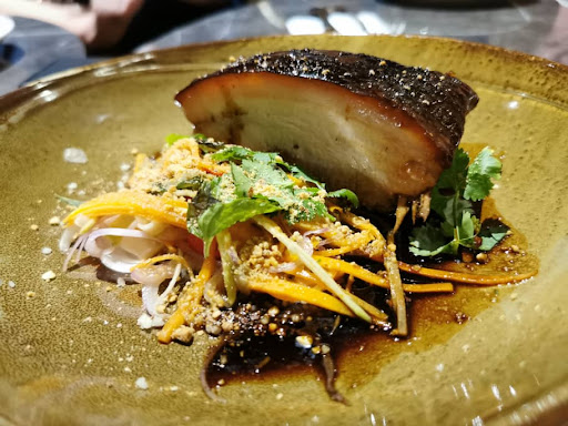 ◾Signature roast pork - perhaps the default order for most wine drinkers as the meats pair well with wines, or whisky. ◾Bacon + egg pizza - generous with mozzarella cheese and tomato sauce on top of the bacon and egg.. anything with bacon is always good for me and this is no exception ◾gourmet sausages - grilled to perfection and great with wines. ◾grilled baby octopus with Asian spice mix, shaoxing wine and sesame seeds. ◾Claypot "mousetails" - the rendition of classic lou shu fun topped with prawn, pork, runny duck eggs and pork crouton. They make one mean Claypot lou shu fun ◾grilled salmon steak with lemongrass oil and leek vichyssoise... Asked for medium and medium it was delivered. No complaints. ◾USA Bone-in Chop with quinoa and baby spinach - something to satisfy the carnivore in me. ◾6-Hour braised pork belly with couscous, Thai salad, pork glaze, coriander and crushed nuts..